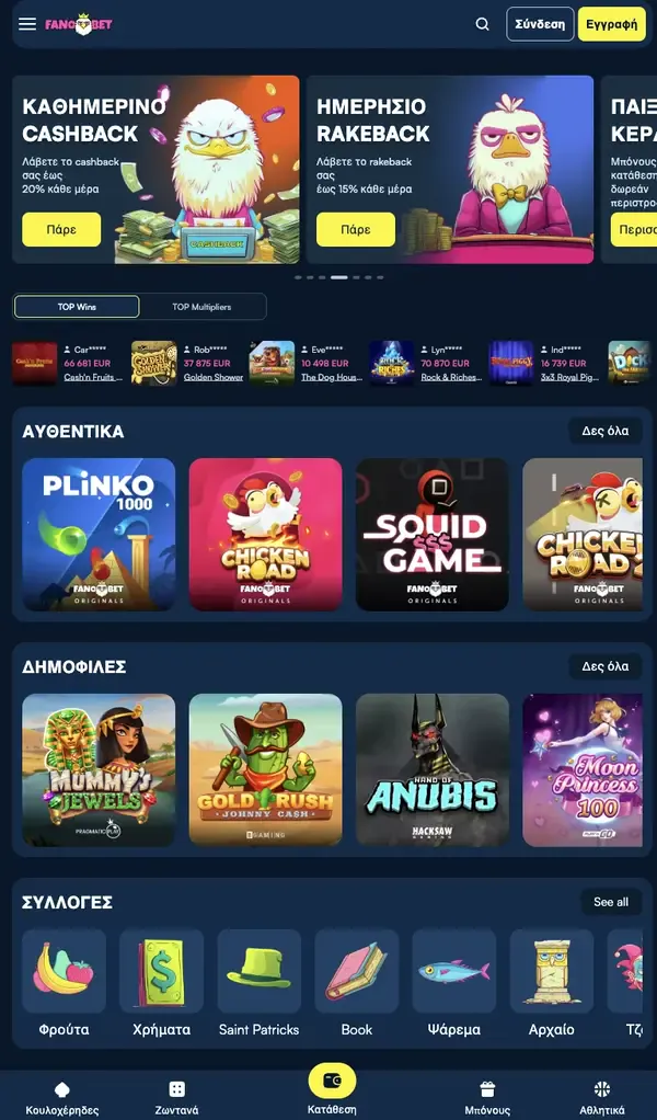 Η πλατφόρμα μας για κινητά καλύπτει τις βασικές κατηγορίες που περιμένουν οι παίκτες: κουλοχέρηδες, live dealer τραπέζια, κλασικά επιτραπέζια παιχνίδια, πόκερ, μπίνγκο, στοίχημα και εικονικά αθλήματα. Αν σας αρέσουν οι γρήγορες περιστροφές, θα βρείτε FanoBet κουλοχέρηδες δίπλα σε πολλά ακόμη είδη, με RTP που συνήθως εμφανίζονται στο εύρος 93.96%–97.30% σε όλη τη βιβλιοθήκη μας.